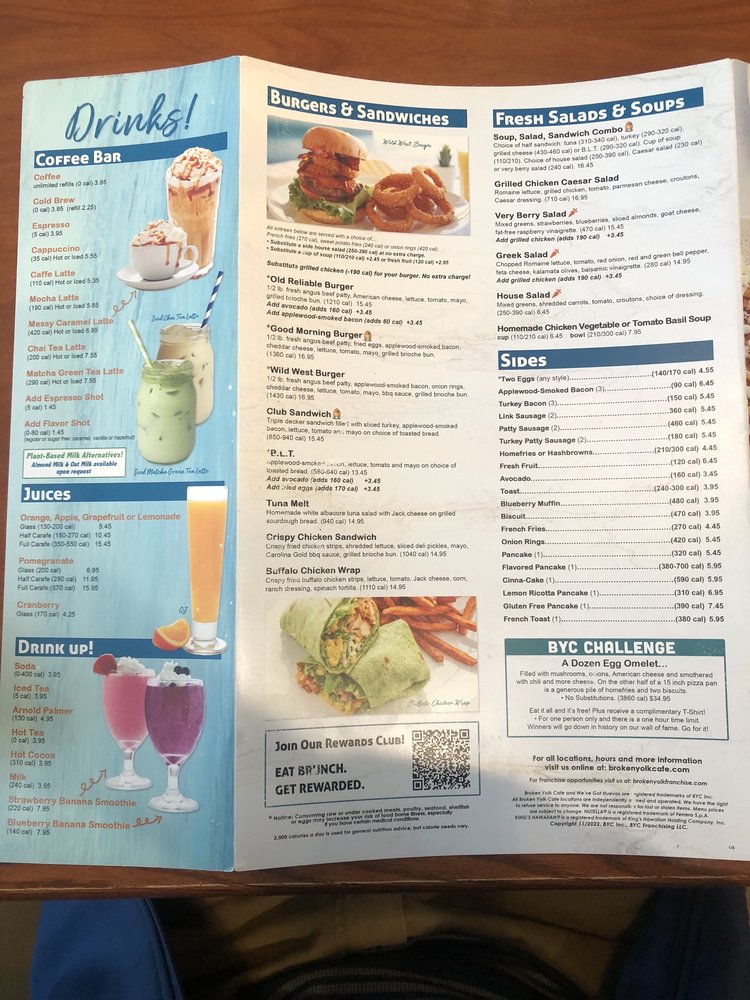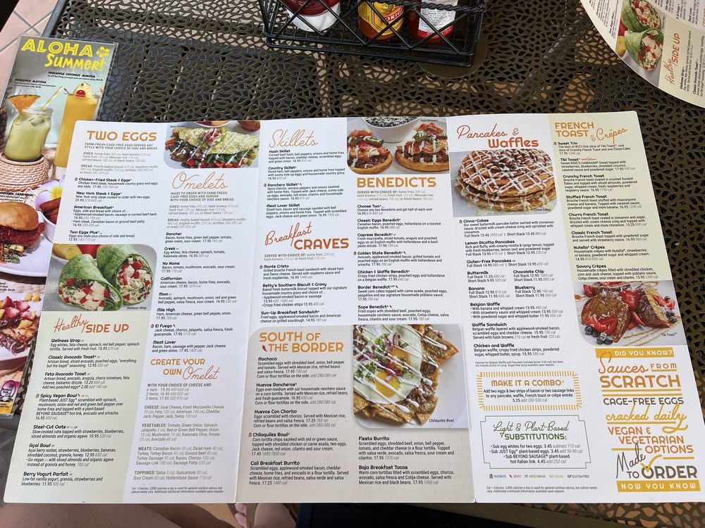 Introducing the menu at Broken Yolk Cafe La Quinta is a delightful journey into classic American breakfast and brunch. Nestled in the heart of La Quinta, this café is famous for its vibrant skillets and fresh ingredients. The Ranchero Skillet combines sautéed homefried potatoes with spicy chorizo and topped with sunny-side-up eggs and ranchero sauce—a dish that promises a flavorful start to your day. For a lighter option, consider the Avocado Toast, featuring creamy avocado and poached eggs on artisan grain bread, seasoned to perfection.